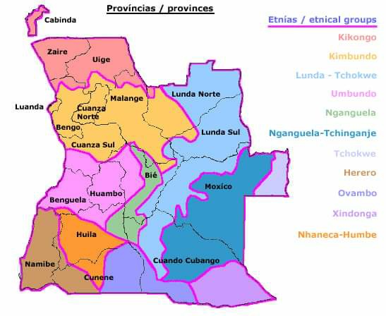 Os três grupos étnicos dominantes são os Ovimbundu, umbundo os Mbundu (melhor chamados de Ambundu, que falam Kimbundu) e os Bakongos.