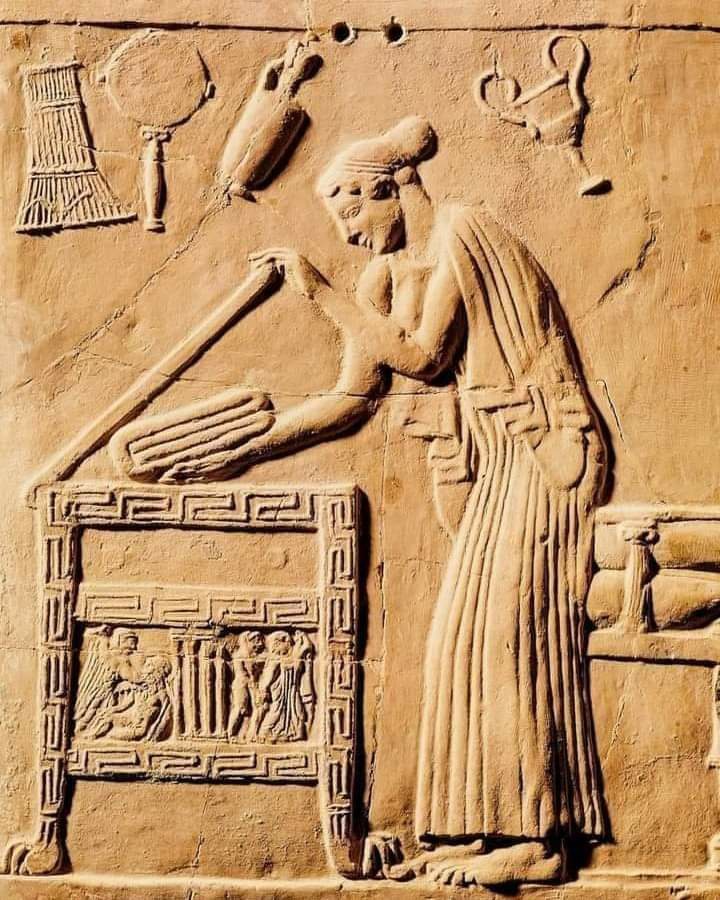 This 5th-century BC Greek terracotta relief, or “Pinax,” from Locri in Calabria, depicts a woman placing her robe in a chest, symbolizing trousseau preparation in ancient Greek culture. Now on display at the Museo Nazionale Della Magna Grecia.