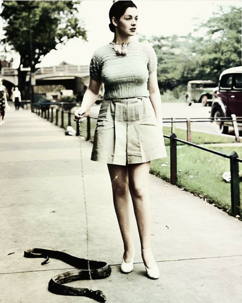 In 1939, burlesque dancer Zorita, renowned for her provocative and exotic performances, struck a dramatic pose with her pet snake, capturing the era’s fascination with sensuality and the allure of the unconventional. Adorned in glamorous, revealing attire—likely decorated with sequins, feathers, and beads—Zorita exuded confidence and charisma, her steady gaze commanding attention as the snake coiled around her body. The snake, a defining feature of her act, symbolized both beauty and danger, amplifying the exotic mystique that made her performances so captivating. In the world of 1930s burlesque, it wasn’t just about striptease—it was a theatrical spectacle, a celebration of fantasy and taboo, with performers like Zorita redefining sensual entertainment.