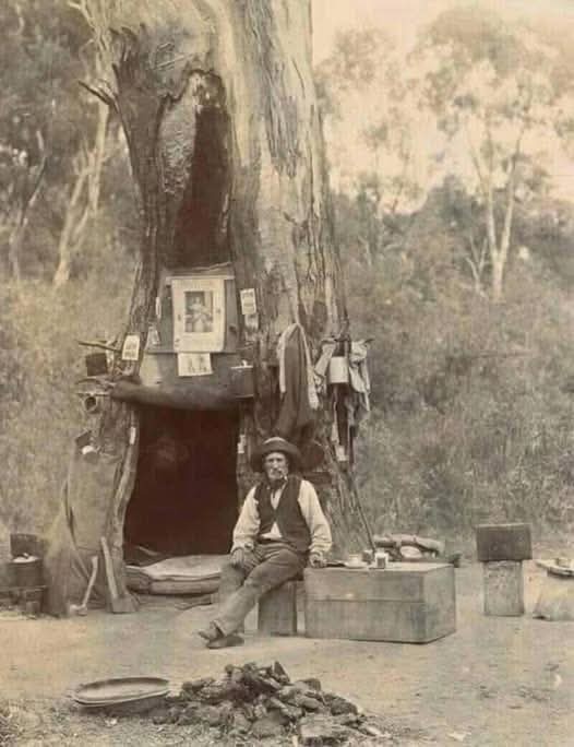 This photograph not only captures a moment in the life of a swagman but also serves as a symbol of Australia’s colonial past, highlighting the resilience and endurance of its people. Swagmen like the one pictured in this scene were part of a larger narrative of exploration, hardship, and survival, and their stories became embedded in the nation’s folklore. The hollow gum tree, as a symbol of both the land and its people, offers a glimpse into a rugged way of life that was both challenging and deeply connected to the Australian landscape.