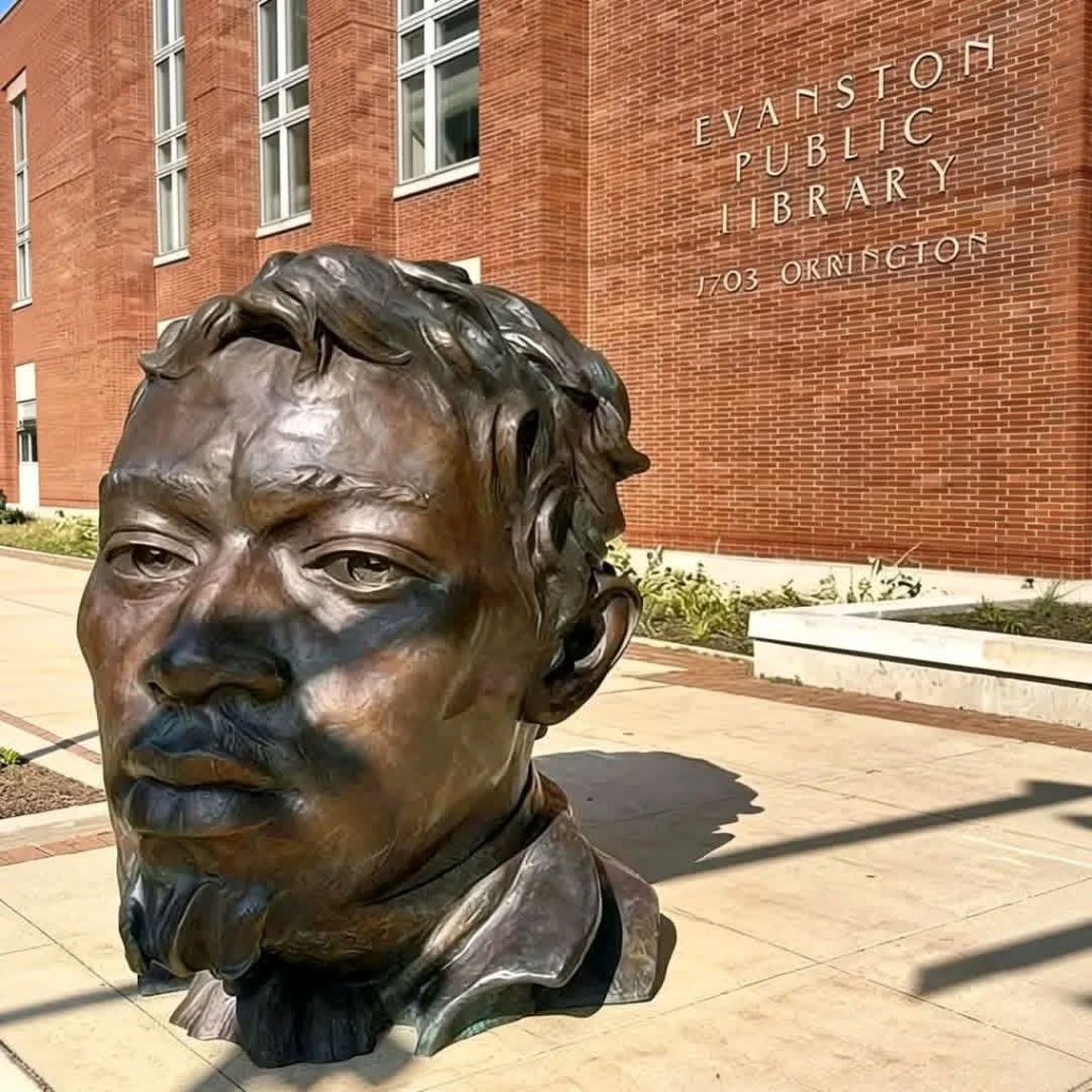 🗿 A striking bronze bust outside the Evanston Public Library