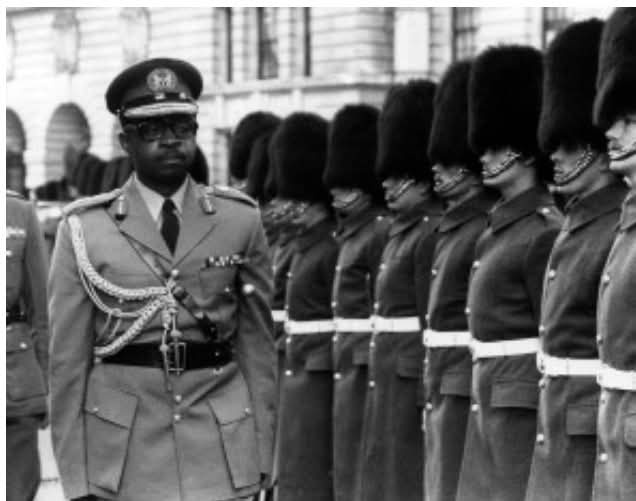 Danjuma inspects the Guard of Honor, 1st battalion Coldstream Guards, at the British Ministry of Defense. Source: Central Press/Getty Images