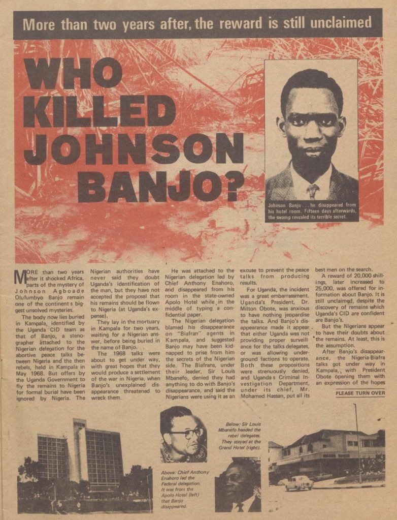 In the middle of the civil war in May 1968, Nigeria and Biafra met in Uganda for peace talks. The Nigerian delegation included Johnson Banjo, a 35-year-old typist who would become the main character of a mystery that remains unsolved till today.